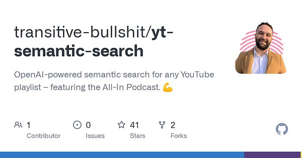 Re: Prediction #2 Another great AI semantic search project by Travis Fischer gives us the ability to search any YouTube playlist or channel for information nuggets.
